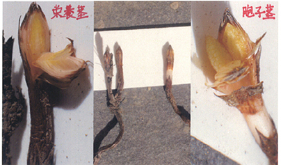 ● 地下茎の節から地上に出ている茎に「つくし」と「スギナ」がある。スギナを「栄養茎」、つくしを「胞子茎」と呼ぶ。