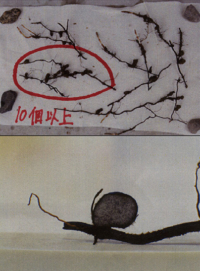 スギナを何度も掘り返しているうちに発見した。土の塊かと思ったが、イモのようなものだ。長さ十数㎝の地下茎に1〜2個付いているものから10個以上あるものまでさまざまだ。どの季節にも見られる。ヨウ素液で調べるとでんぷん反応があり、でんぷんの貯蔵場所のようだ。塊茎が、胞子茎が出る栄養源に違いない。塊茎があることが、つくしの出る条件ではないか。