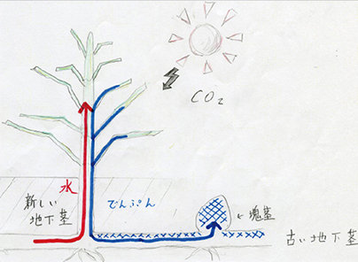 植物が養分を作る仕組みは【二酸化炭素+水+光のエネルギー=でんぷん】だ。スギナ(栄養茎)は全身で光合成ができる。光合成に必要な水は地中深くの根から確保する。でんぷんはどこに蓄えられるのか。地下茎に蓄えられ、さらに量が増えたら塊茎ができるのか。